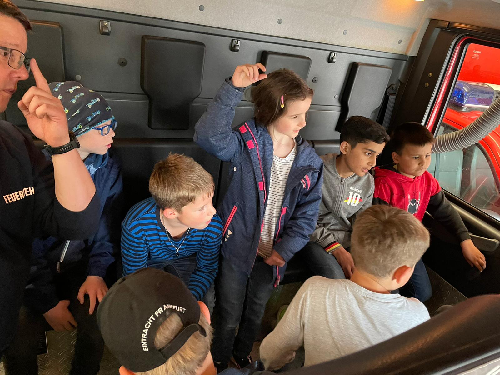 Im Anschluss schauten wir uns zusammen die Mannschaftskabine des LF 8/6 genauer an und lernten Ausrüstungsgestände wie das Funkgerät, die Taschenlampe, die Wärmebildkamera und die Atemschutzausrüstung kennen. Danach kamen wir alle im Kids-Raum zusammen und jeder konnte in Anlehnung an das Spiel “Ich packe meinen Koffer und nehme XY mit” die gelernten Gegenstände in unser gemeinsame Fahrzeug “packen”.