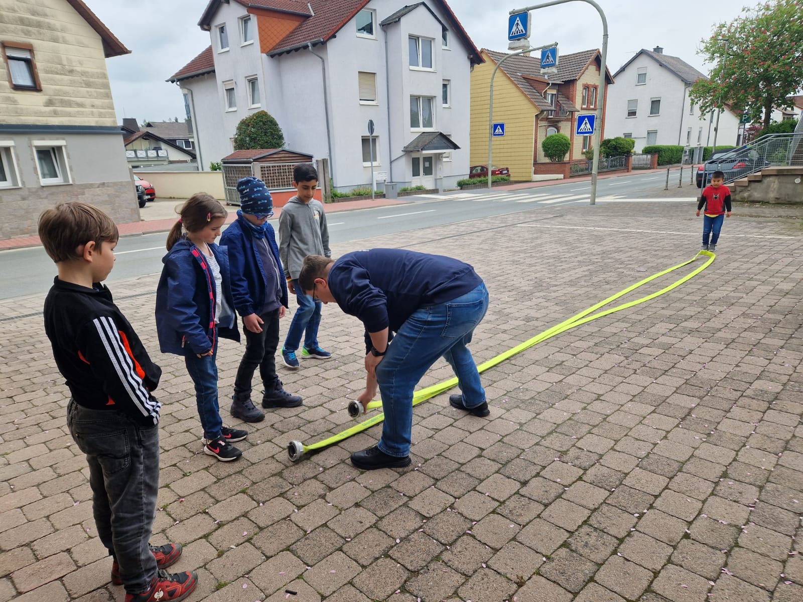 Zu Beginn konnten die Kids unter Anleitung das schnelle Ausrollen eines C-Schlauchs sowie das anschließende einrollen üben. Die Kids halfen sich dabei gegenseitig und hatten jede Menge Spaß.